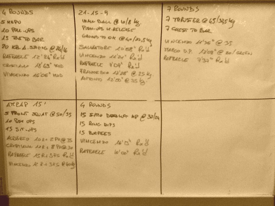 WOD 1: Eseguire, nel minor tempo possibile, 21-15-9 ripetizioni dei seguenti esercizi: